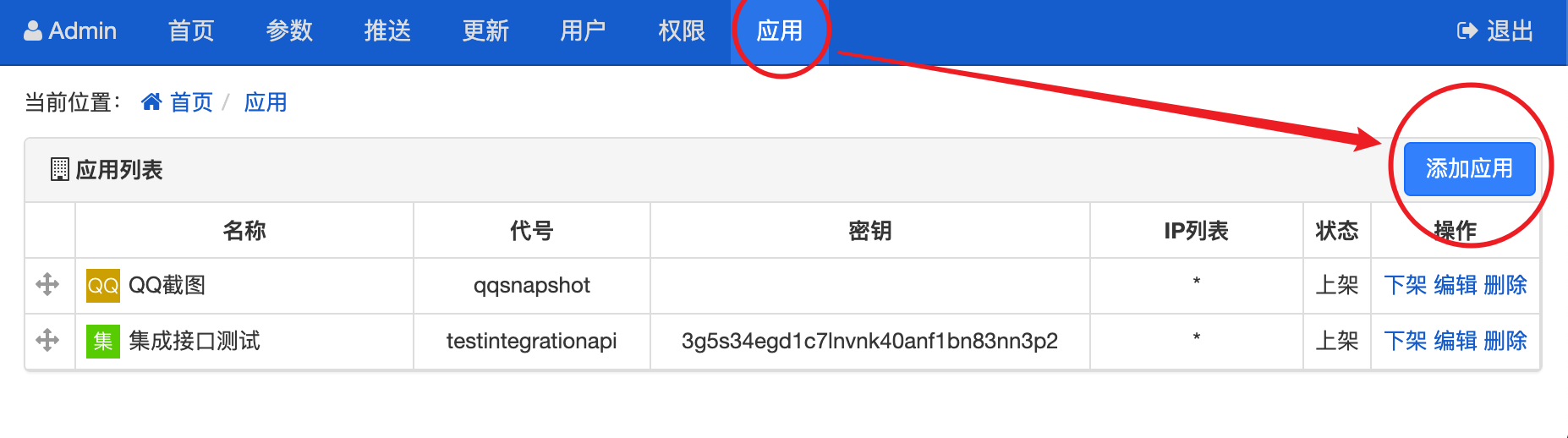 如果还没有添加过应用则需要先创建一个应用,方法是打开后端管理界面(xxb),进入“应用→添加应用”页面: