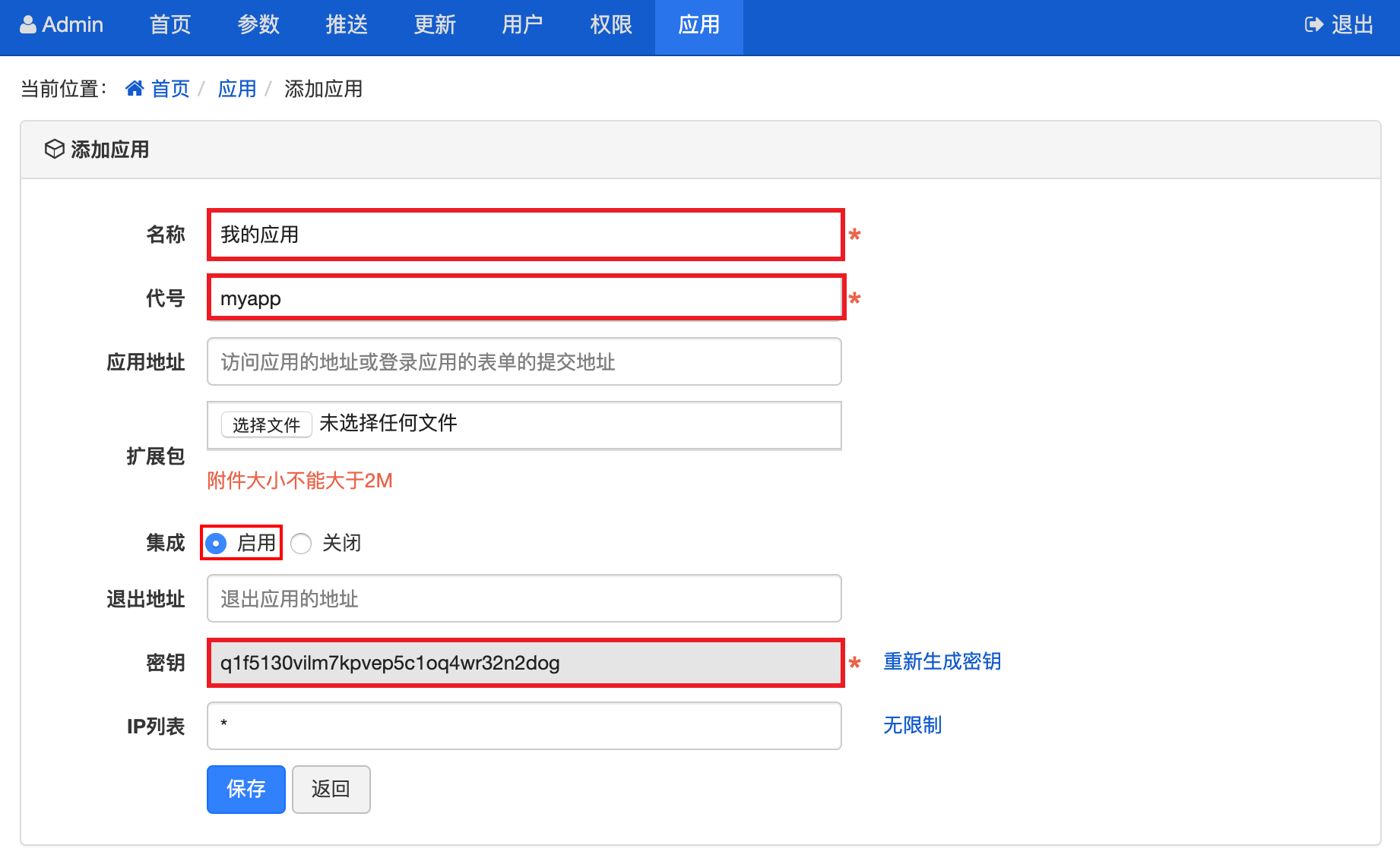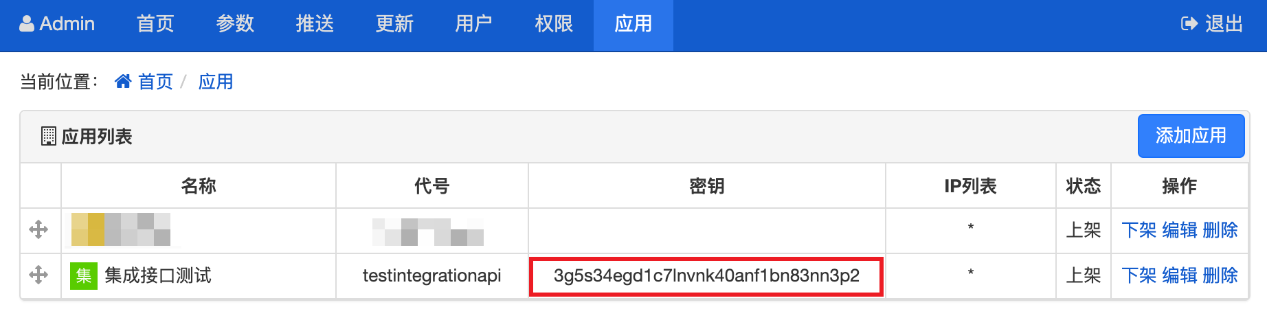 在添加和编辑应用页面,启用集成功能并获取生成的密匙, 也可以从应用列表获取密钥: