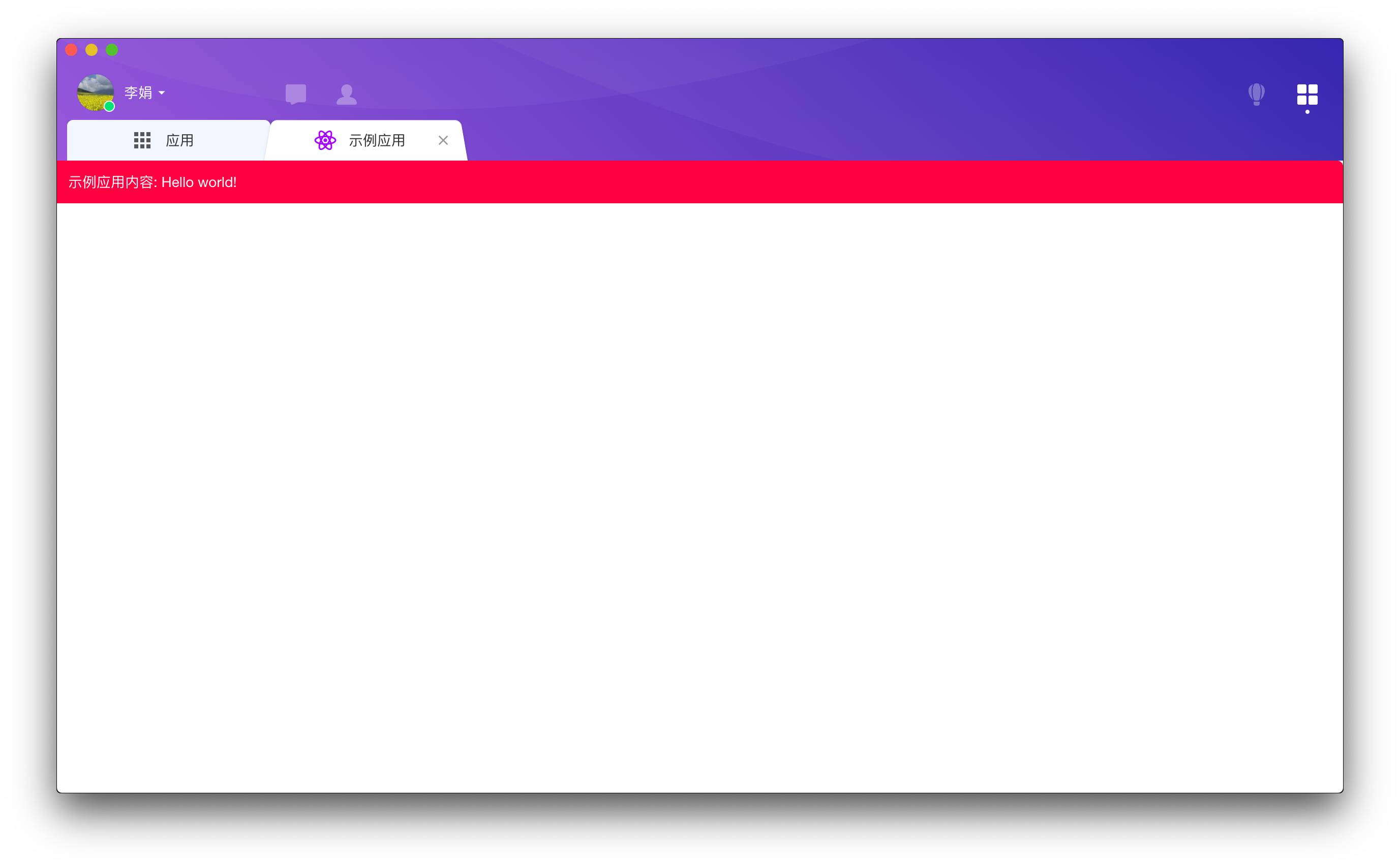 - React 组件应用:在入口模块的MainView属性上设置一个 React 组件作为嵌入的界面,方便的开发一个与官方界面融合的应用,在你的 React 组件中可以使用全部的 nodejs 内置模块,并访问全局扩展对象。