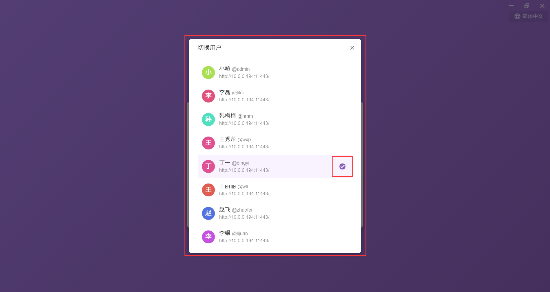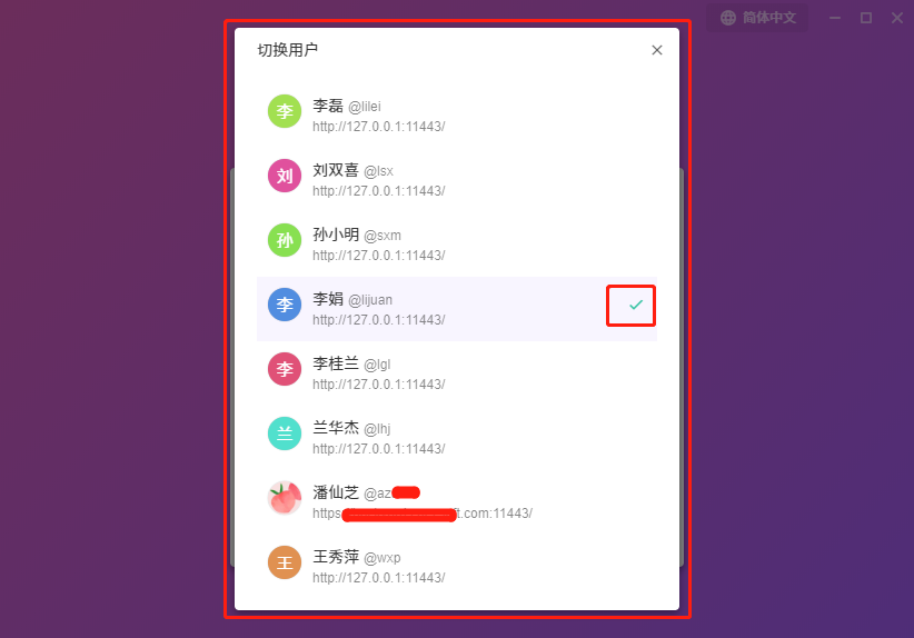 可切换用户的列表,右侧打勾的显示的是登录页面填充的用户。