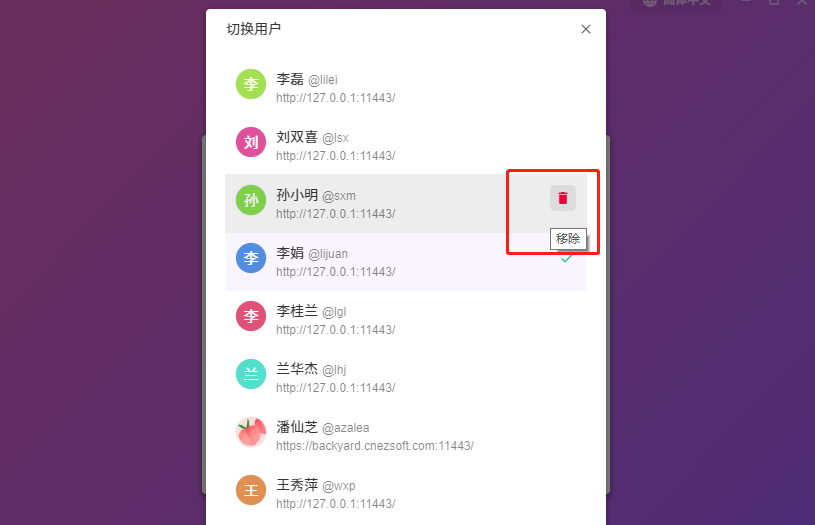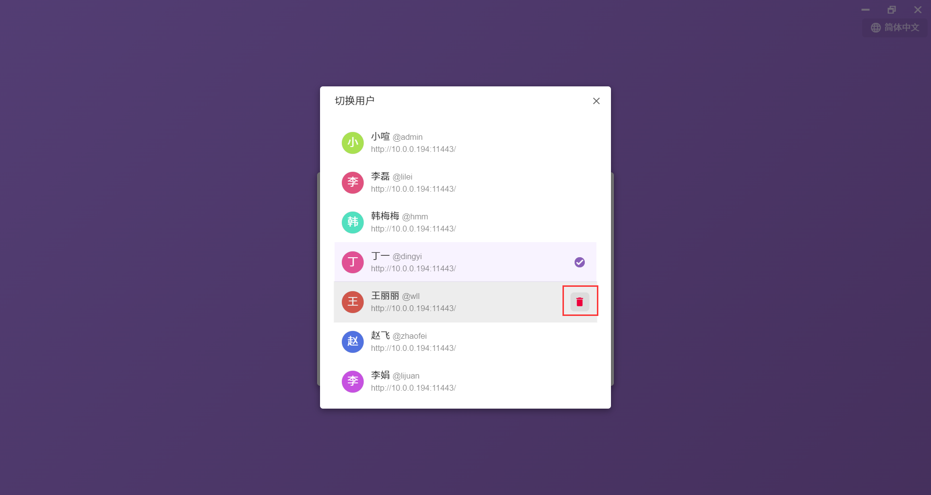 在切换登录账号对话框中选择要登录的用户来登录,点击列表右侧的删除图标则可以删除在本地保存的账号。