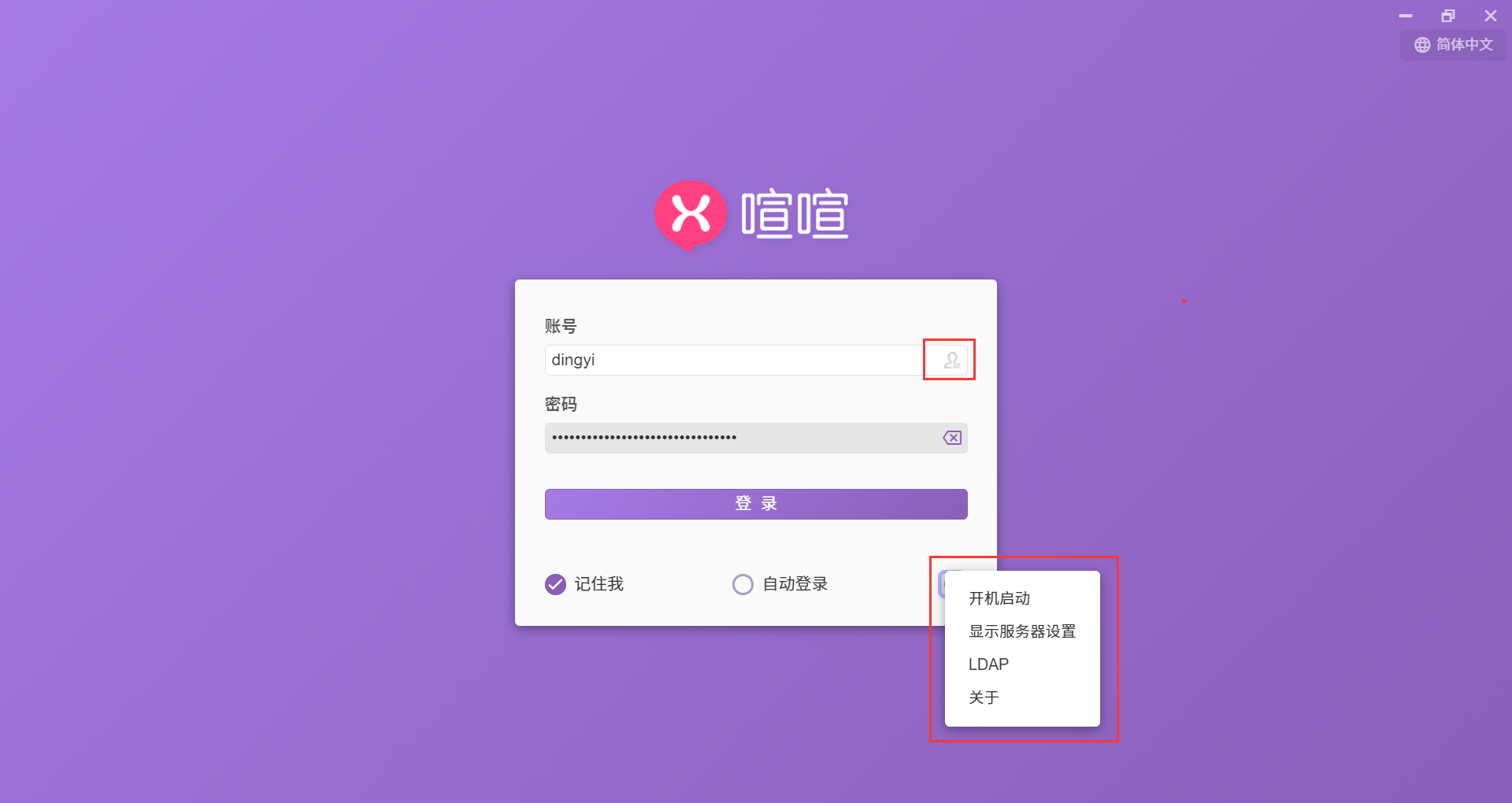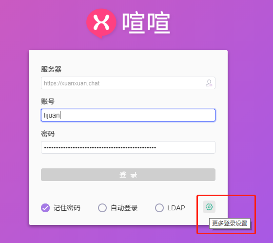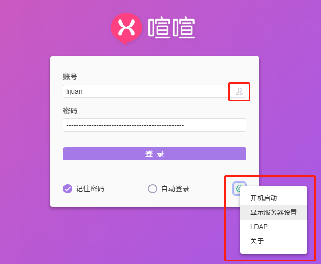 登录页面服务器设置是默认隐藏的,更多登录设置里可以进行开机启动、显示服务器设置、LDAP登录设置以及通过关于来查看喧喧客户端的版本信息。