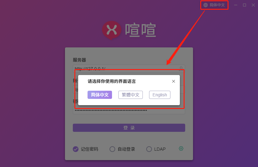 喧喧3.1及以上版本,使用喧喧服务端部署包安装下载的喧喧客户端,登录页面有所更改。