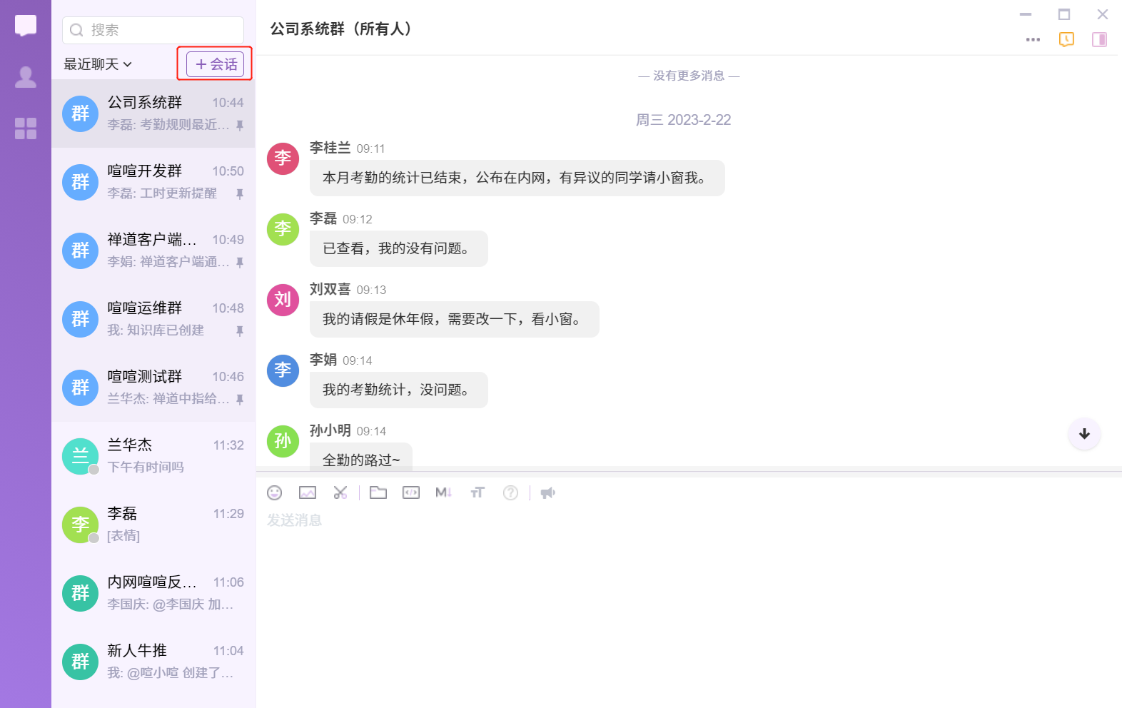 在喧喧中创建新会话比较简单,可以点击会话菜单标签页上的创建会话按钮,打开创建会话对话框。