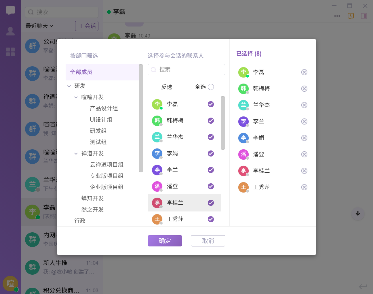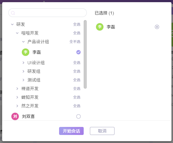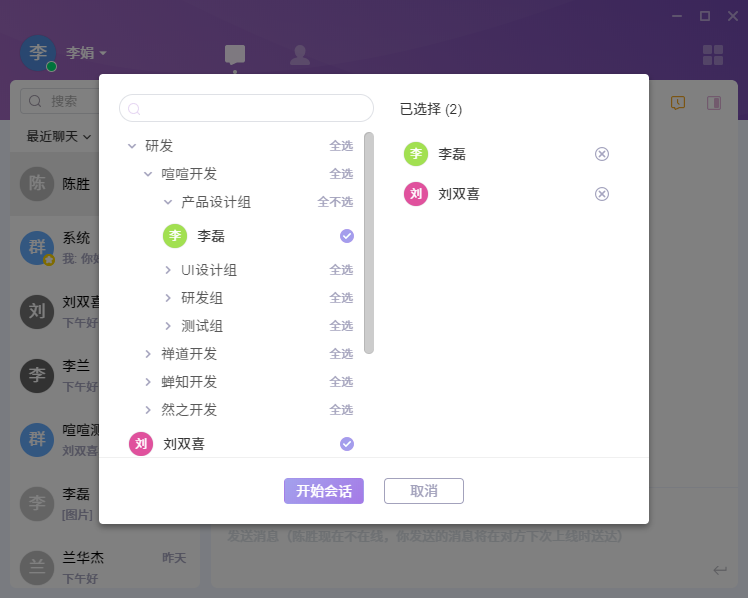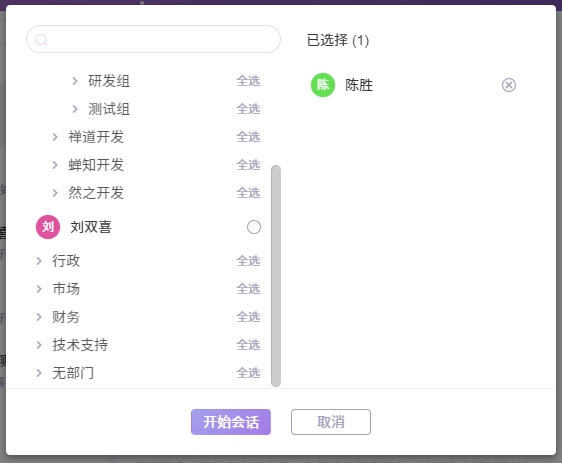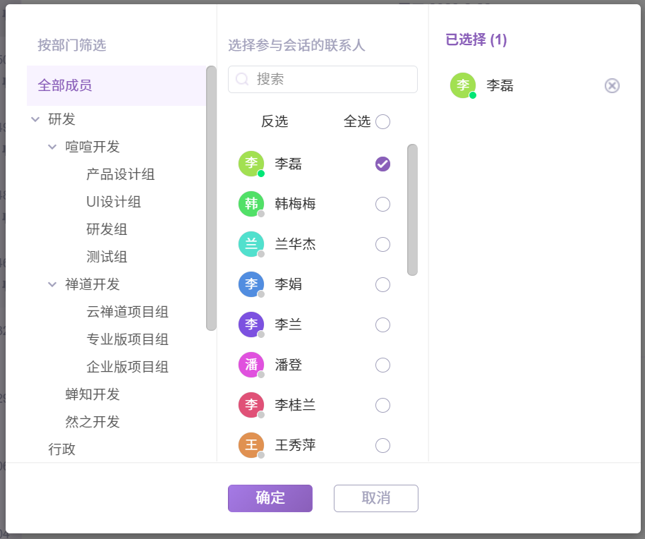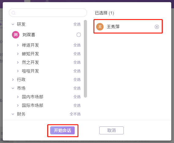 左侧是按照部门结构显示的成员信息,右侧显示已选择参与会话的成员信息。