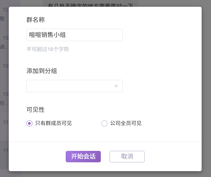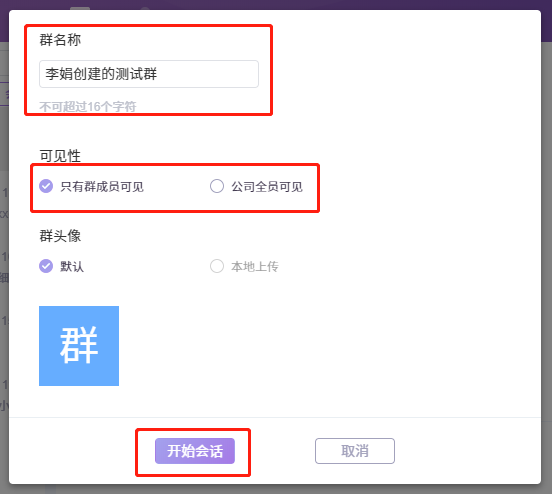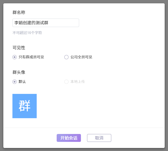 创建会话时,选择的成员数量多2个时,点击开始会话后,跳转到创建群组的页面。