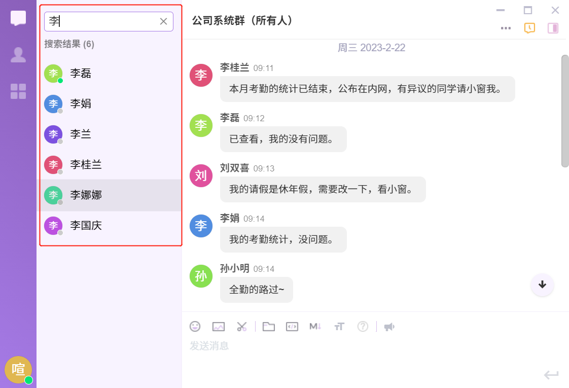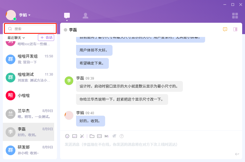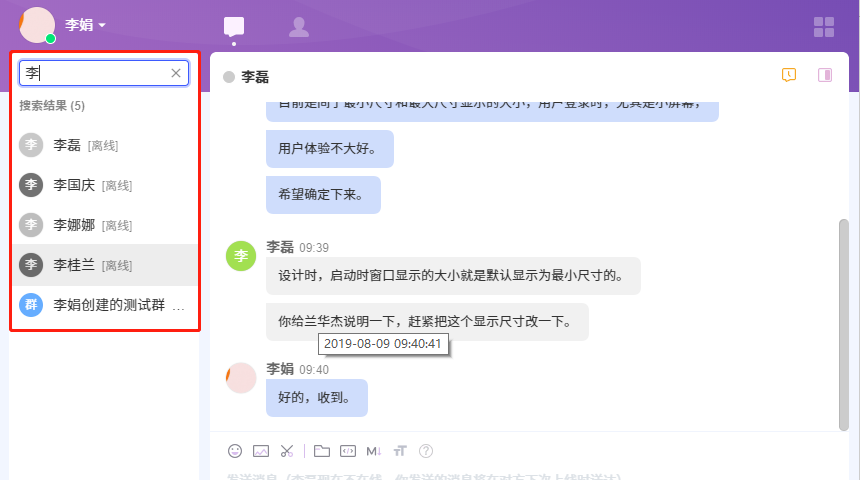 下面我们以搜索“李”为例,来介绍一下喧喧客户端的搜索功能。