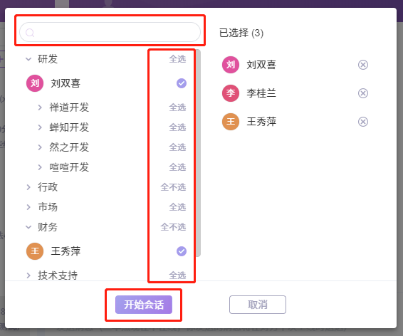 左侧部门结构后面,有全选按钮,方便一次选择该部门的全部成员。当全选后,全选按钮变为全不选。