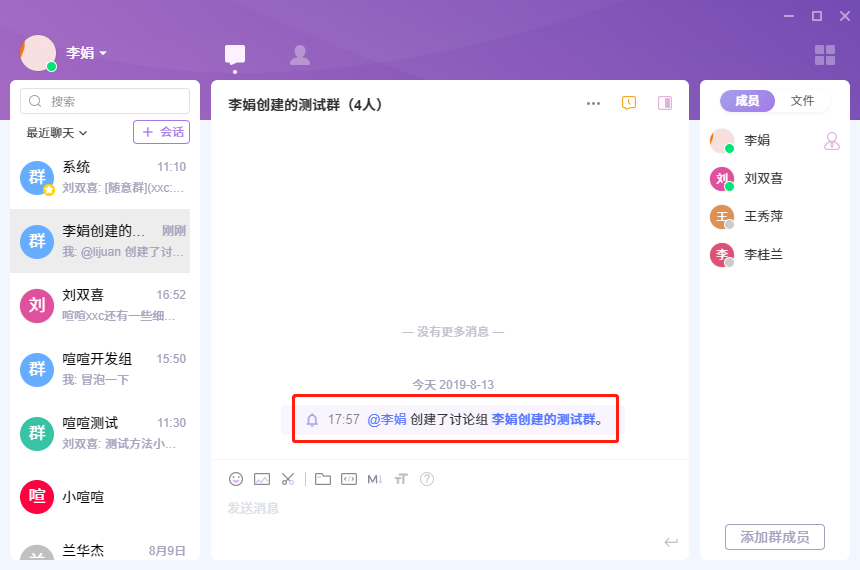 喧喧会给该群其他成员发送广播通知,提示该群组由谁创建。