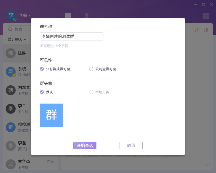 喧喧客户端的创建新会话包含创建一对一的会话和多人会话的群组。
