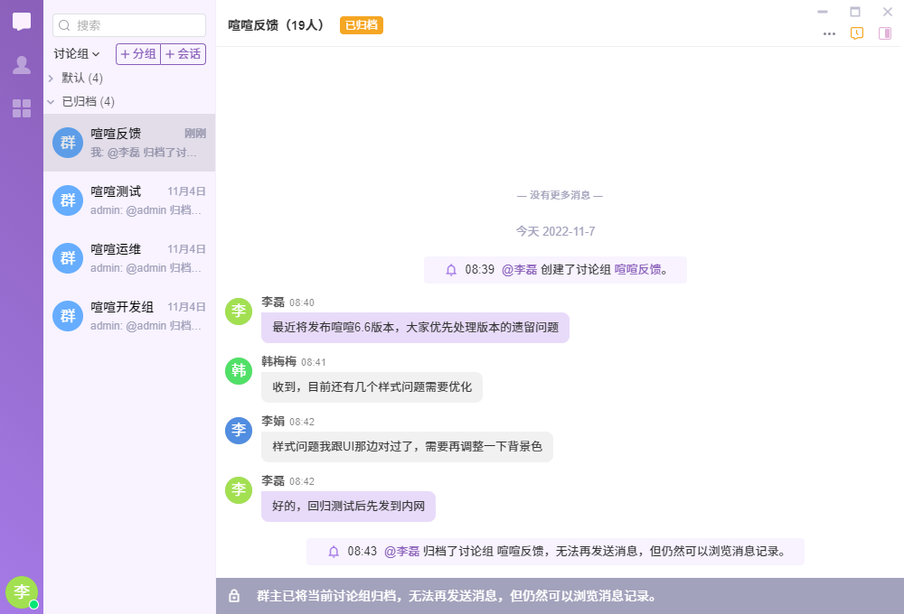 - 归档:群主可以将管理的群组进行归档,已归档的群组不再支持收发消息,成员可以查看所有消息记录,归档后的群组置于归档分组中。若需要再次启用,群主可以进行取消归档。