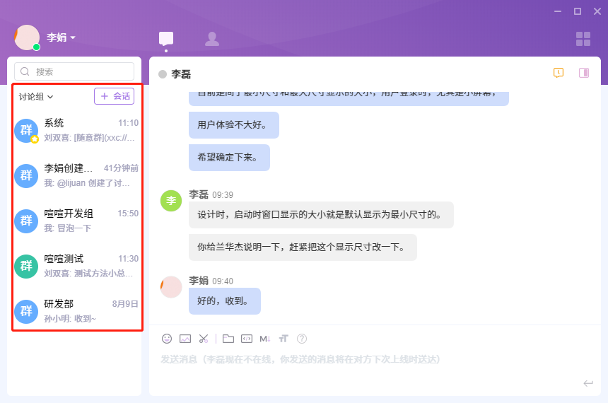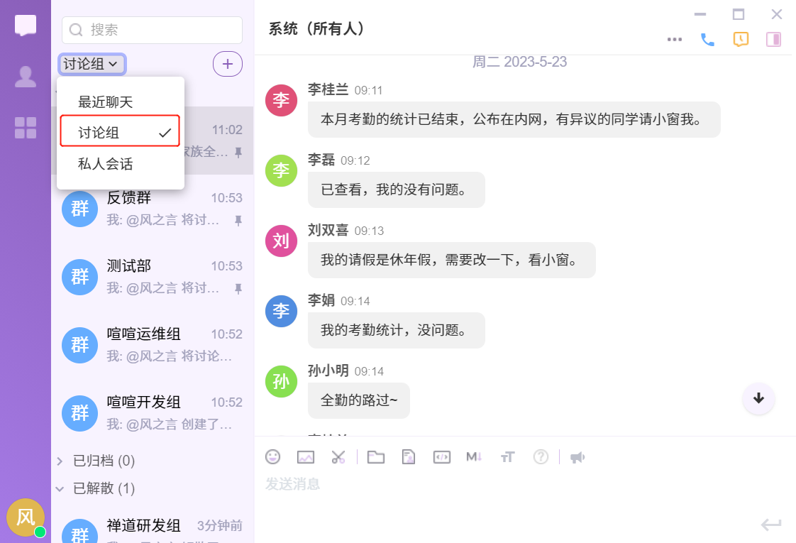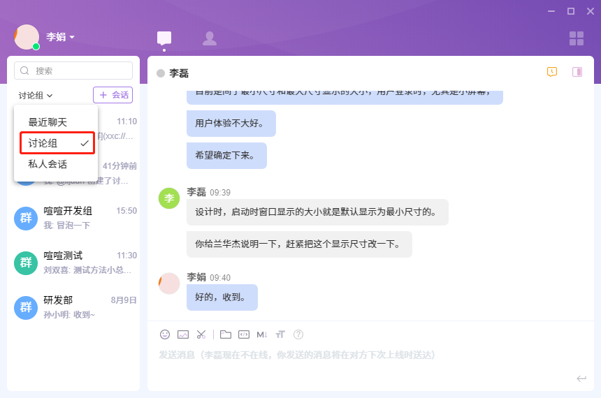 会话列表包括当前用户所有参与的会话,用户可以通过导航上的最近聊天、讨论组和私人会话,切换不同的会话列表。
