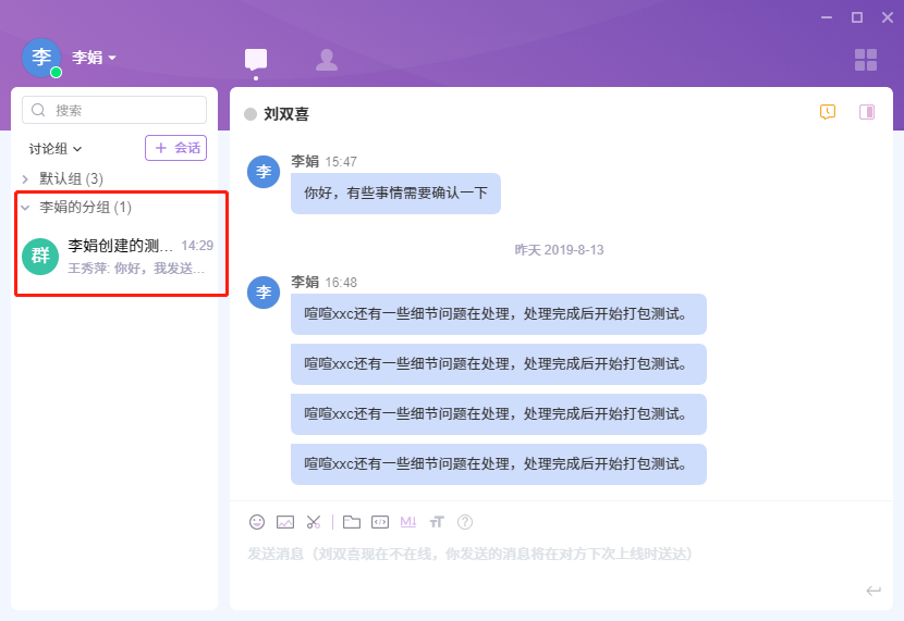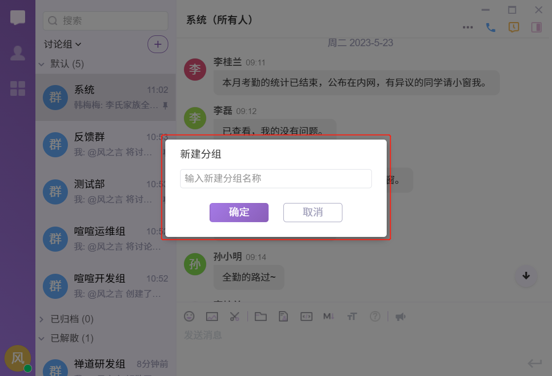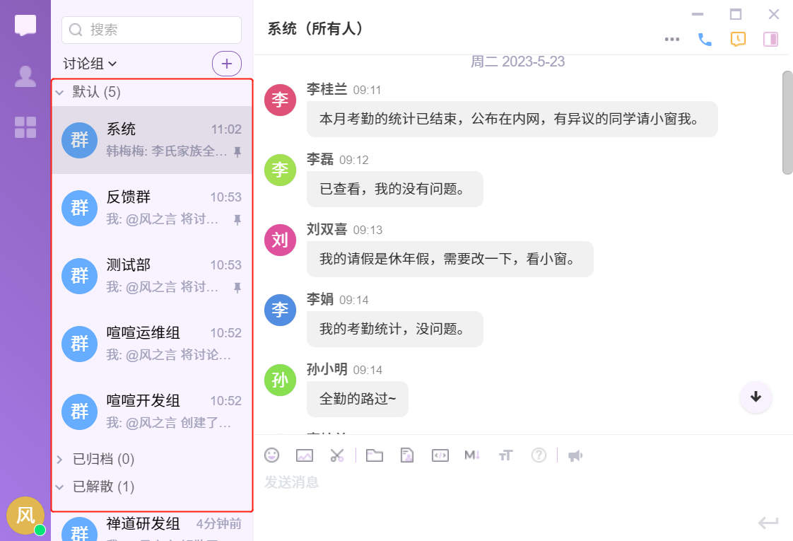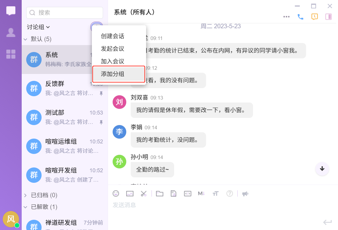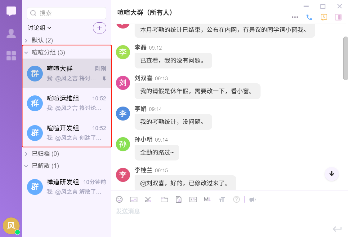 在喧喧客户端中,可随时根据使用需要,创建多成员的个性群组(讨论组)。
