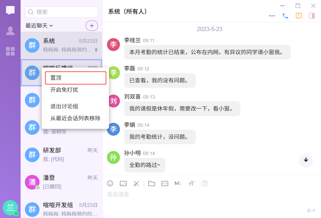 - 置顶: 置顶的会话,会显示灰色置顶标识,默认在会话列表里会靠前显示, 方便快捷访问此会话。