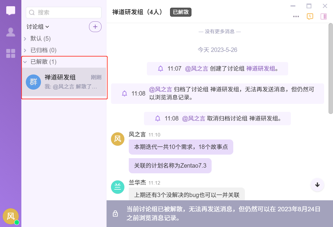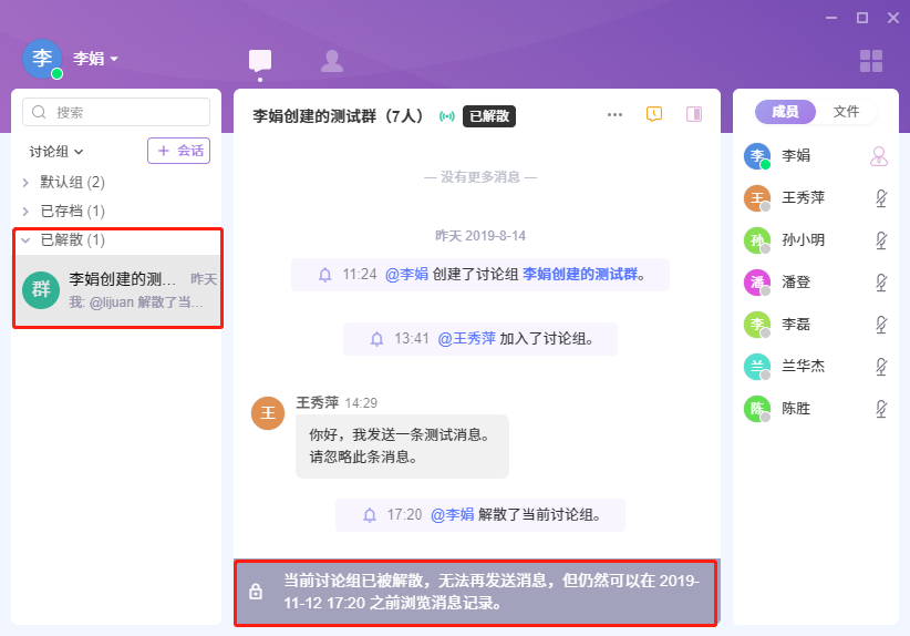 - 解散: 解散该群组,该群组不再在会话列表显示。 显示在讨论组---已解散分组里。保留90天,这期间还可以浏览和查看群组消息记录,过了90天,该群组将被彻底删除。