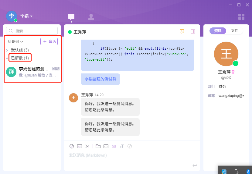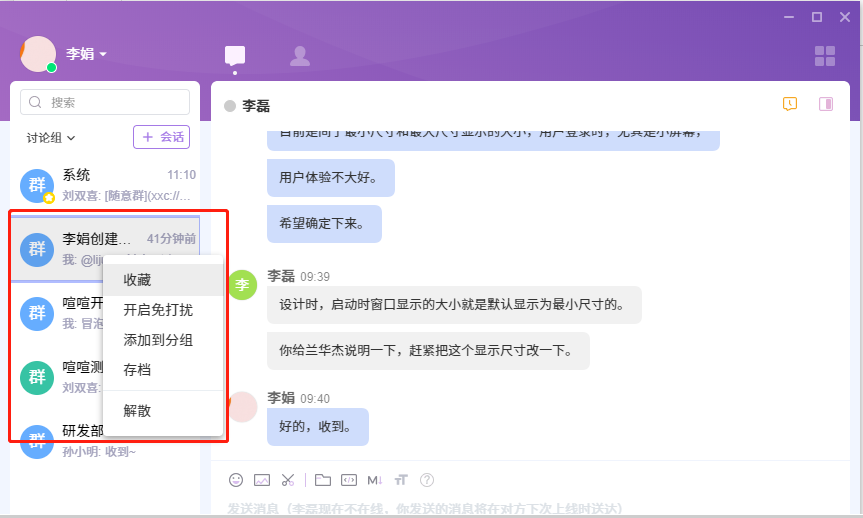 讨论组可置顶、开启免打扰、添加到分组、归档操作,讨论组的群主可以解散该讨论组,群主和管理员可以撤回群消息。