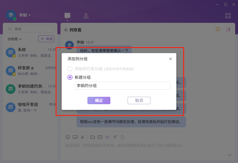 添加到分组后,在会话列表页,会显示新分组和该分组下面的讨论组。