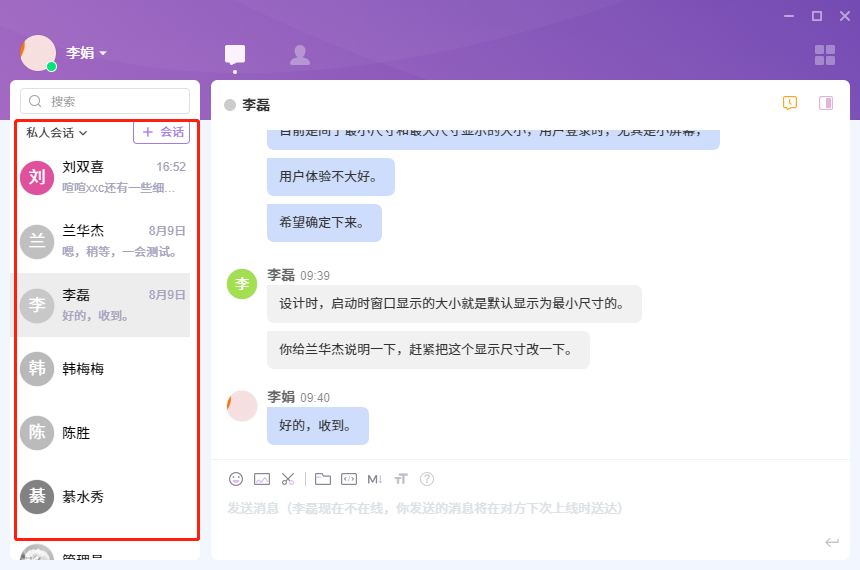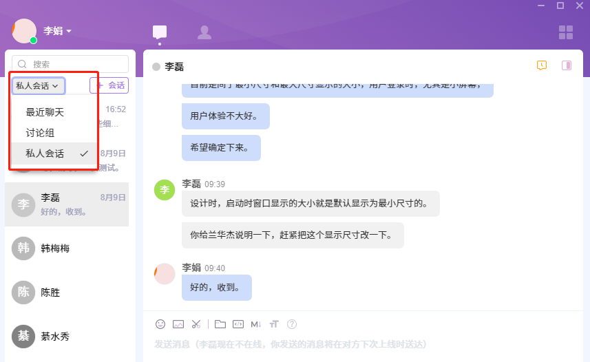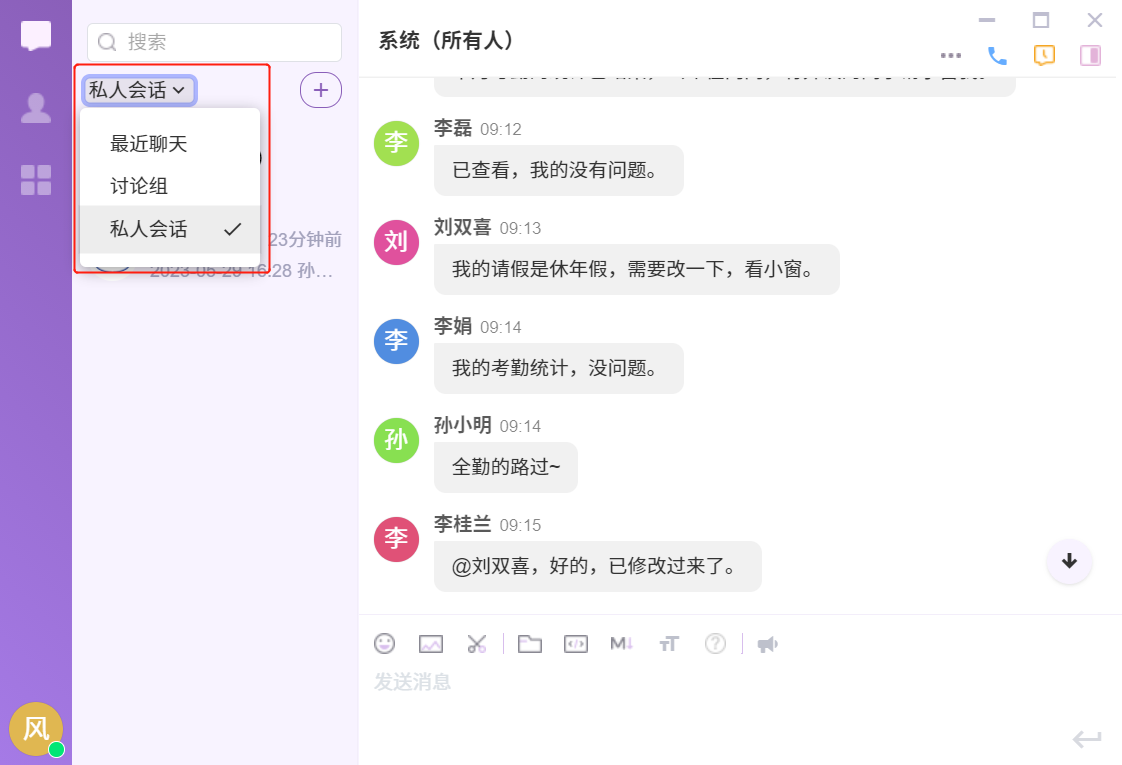 会话列表包括当前用户所有参与的会话,用户可以通过导航上的最近聊天、讨论组和私人会话,切换不同的会话列表。本文档先主要给大家介绍一下会话列表里的私人会话会话列表。