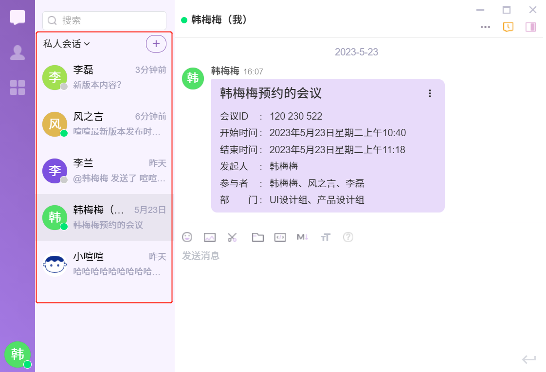 喧喧聊天软件的聊天会话界面由会话菜单和聊天窗口组成。