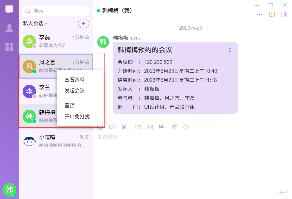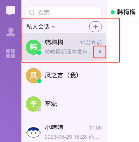 - 开启免打扰: 当会话消息多时,可开启免打扰,免打扰模式会自动关闭消息提醒。