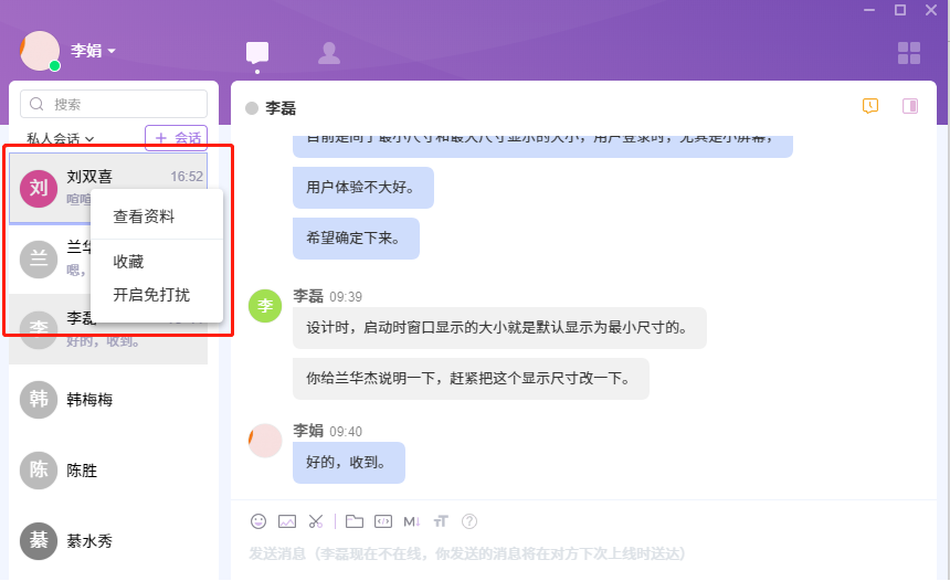 私人会话可以查看资料、收藏、开启免打扰操作。