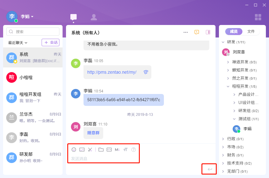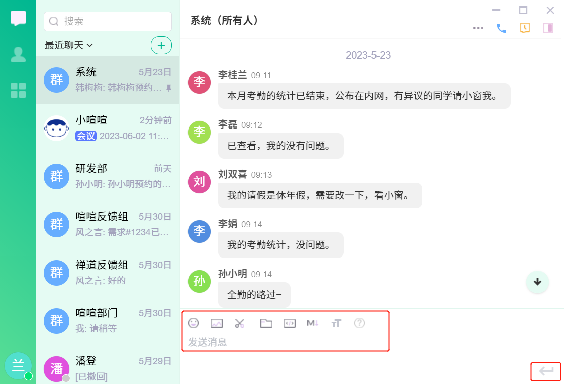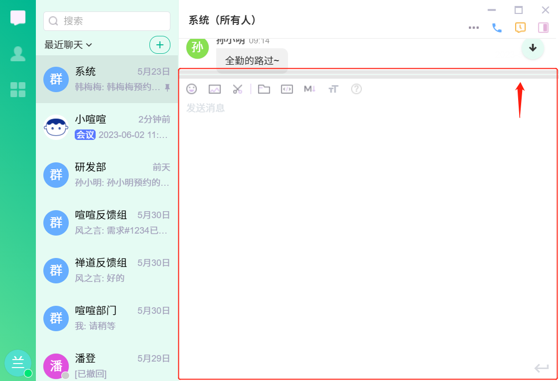 会话聊天的消息输入框,默认高度是能显示3行内容信息,如果有特殊需要,可以向上拉高消息框。