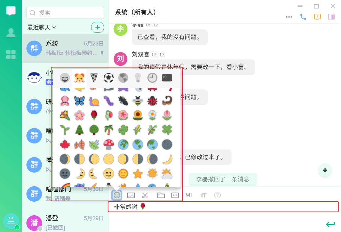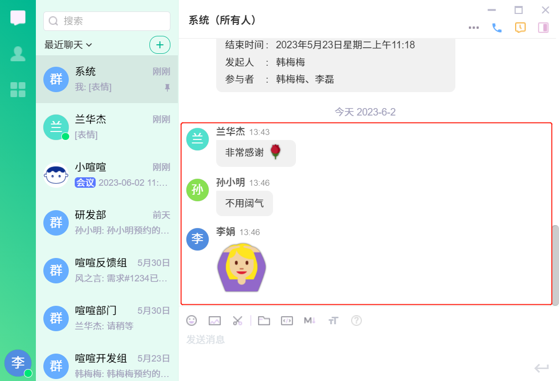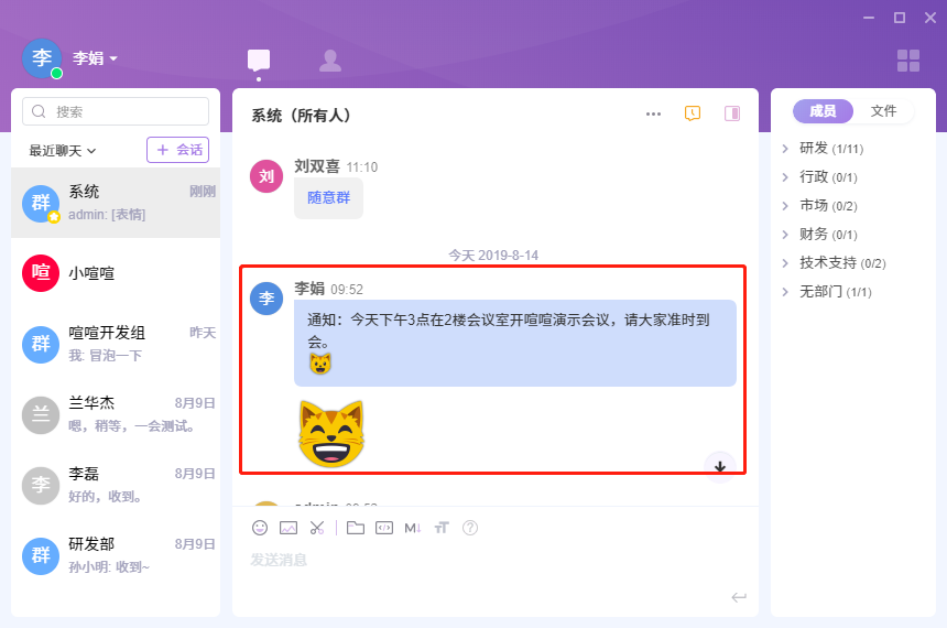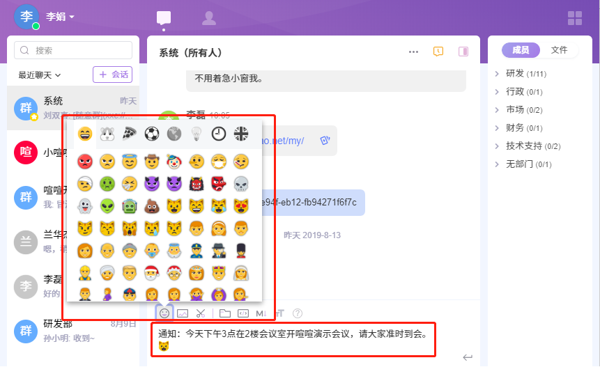 在喧喧客户端的聊天会话框中,你可以直接输入或粘贴 Emoji 字符来发送表情。