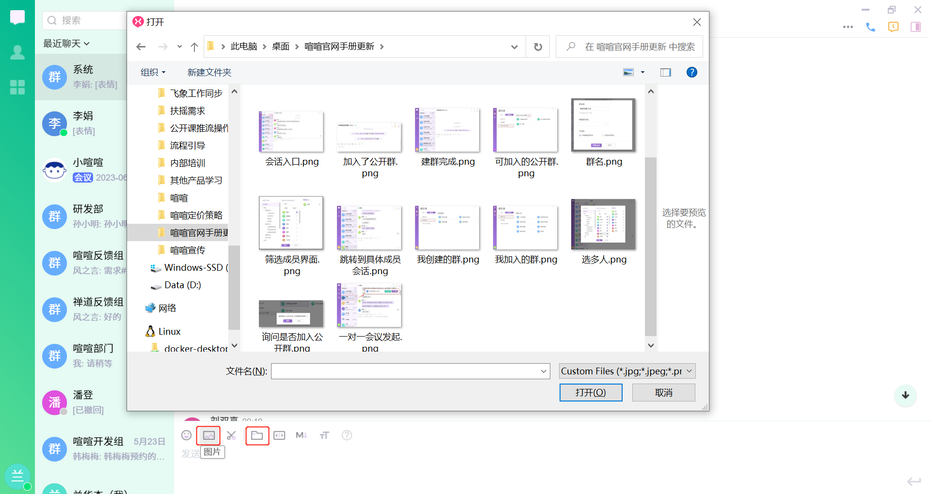 - 通过点击图片或文件按钮从系统中选择要发送的图片或文件,