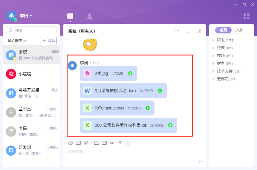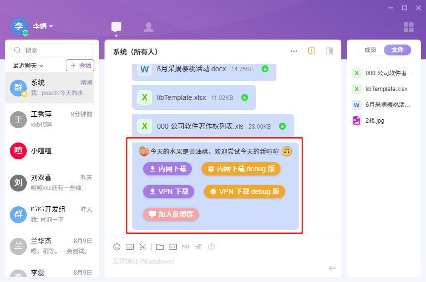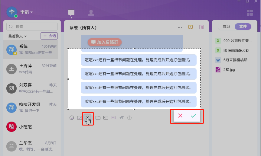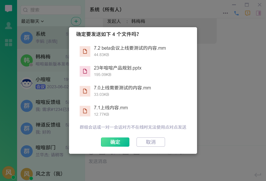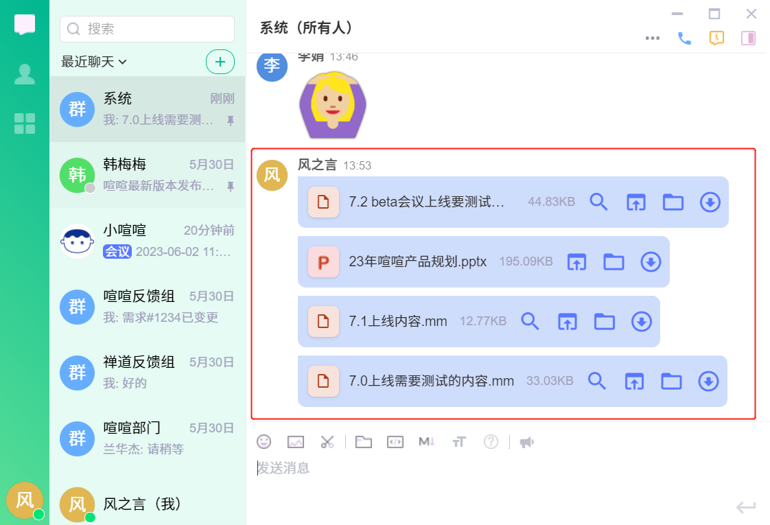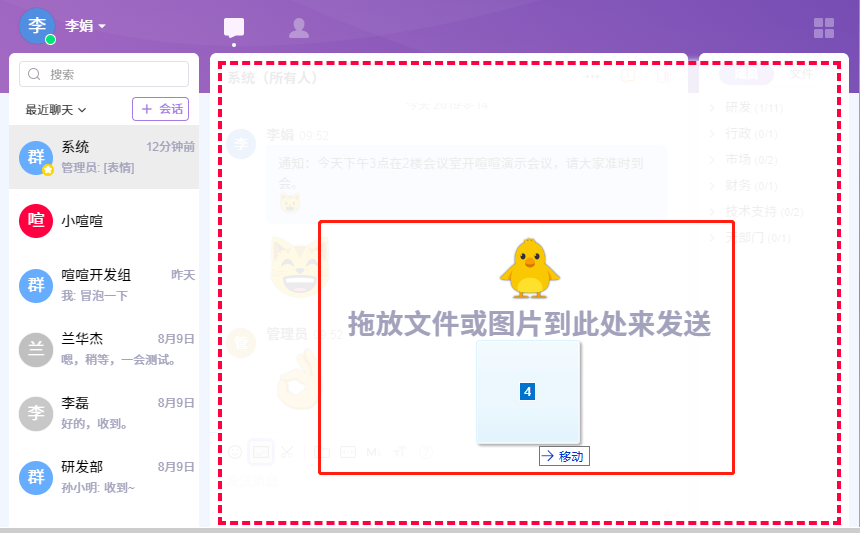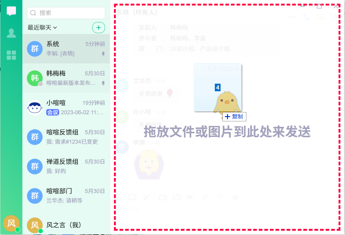 - 也可以直接从系统文件管理器中拖放图片或文件到喧喧客户端当前聊天窗口进行发送。