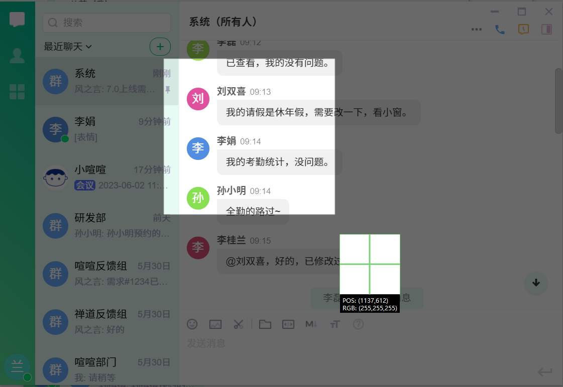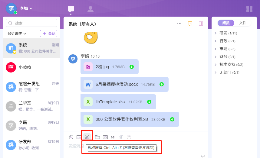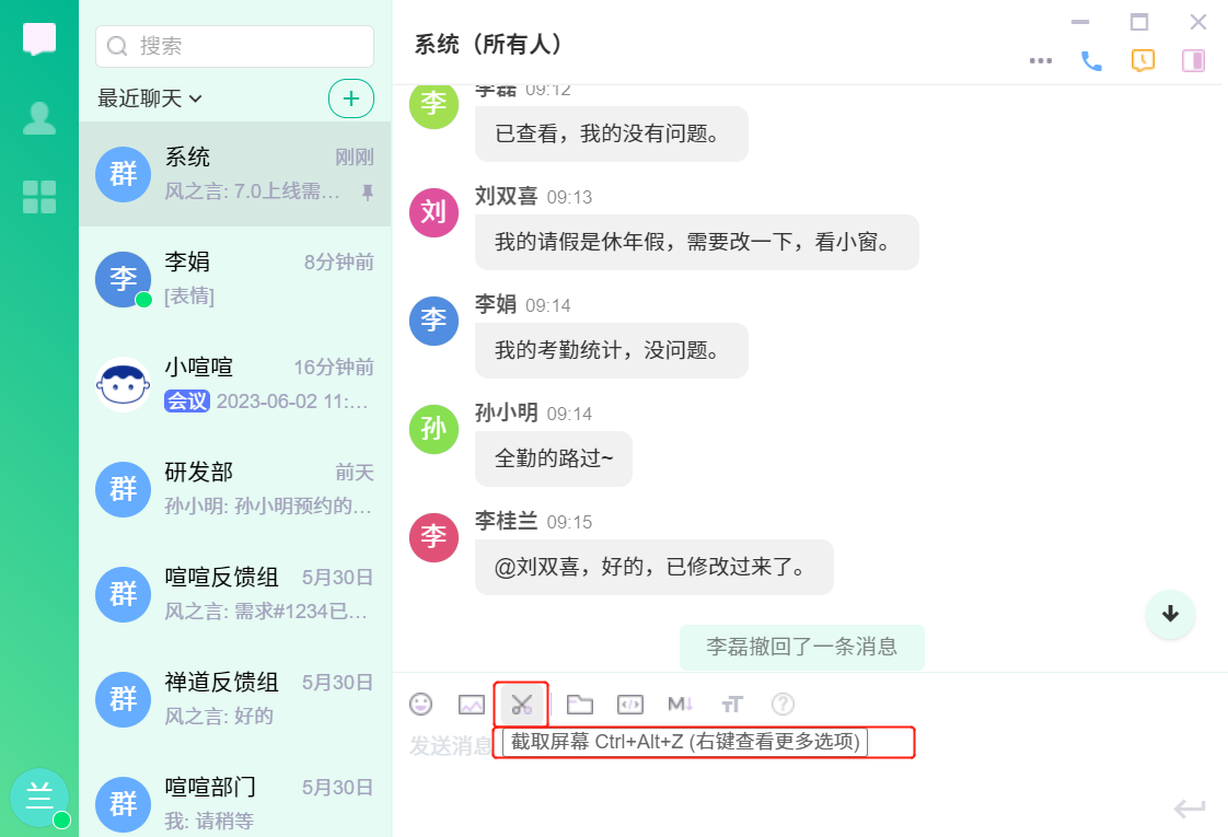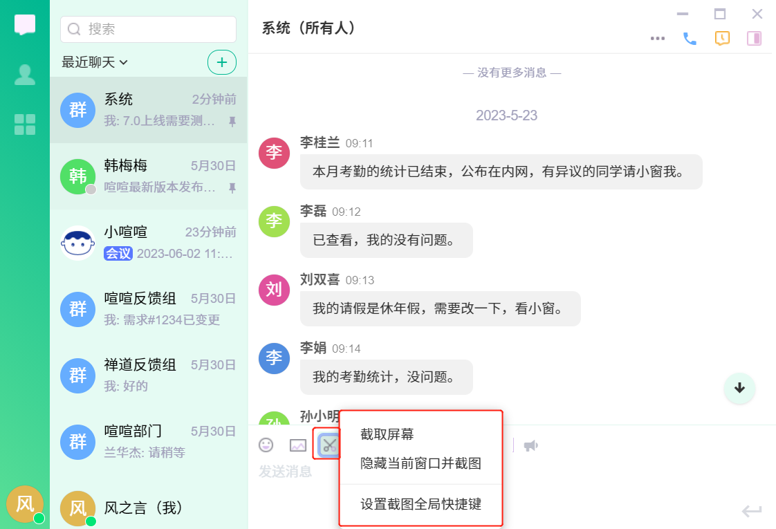 点击会话聊天消息框的截图按钮可以截取当前屏幕图形并发送到会话中。