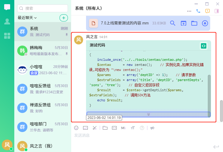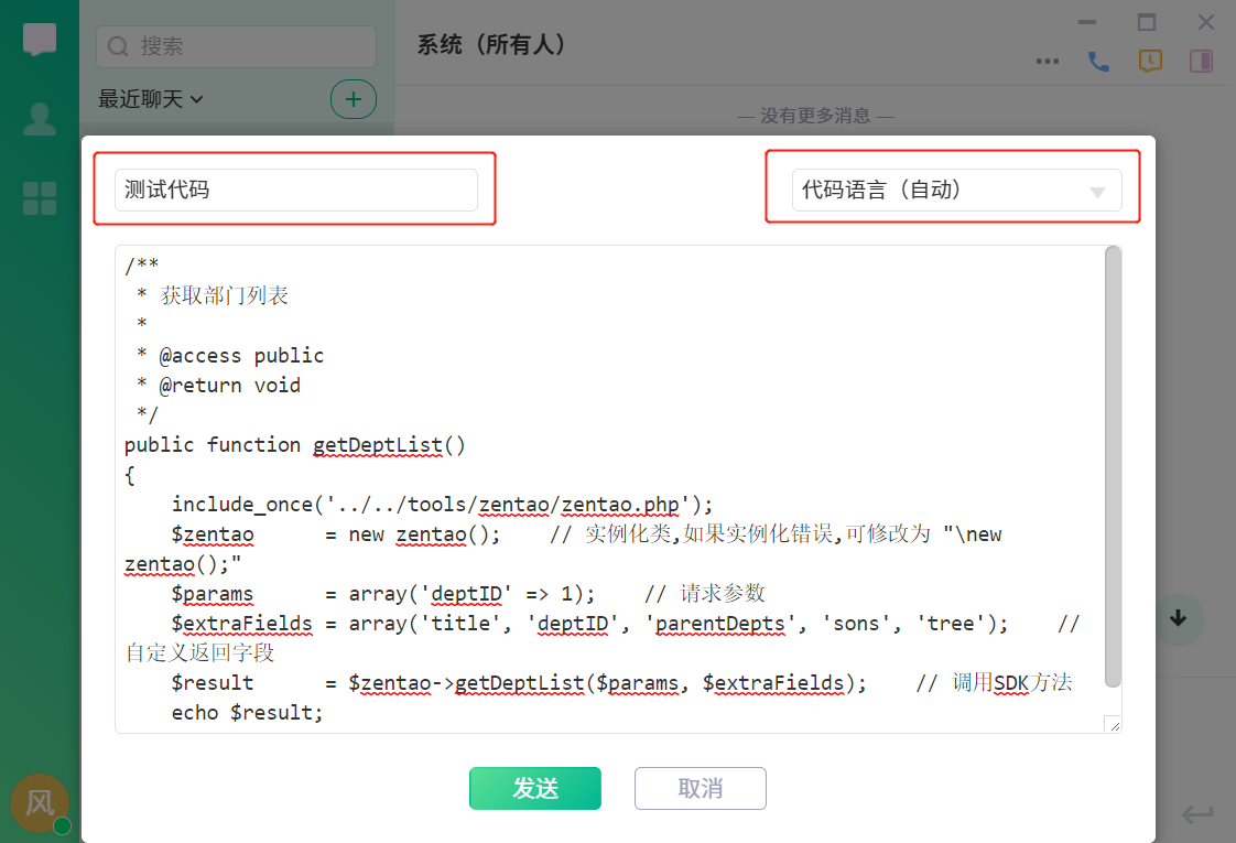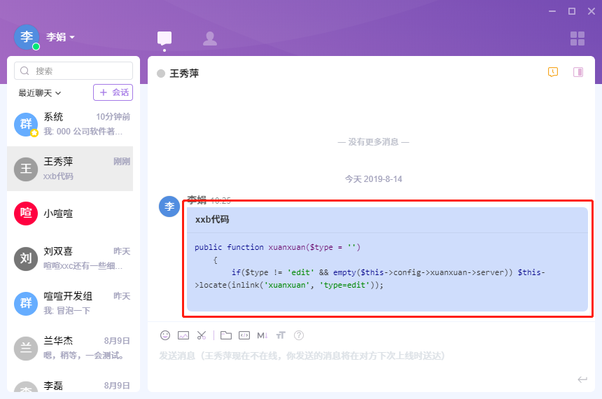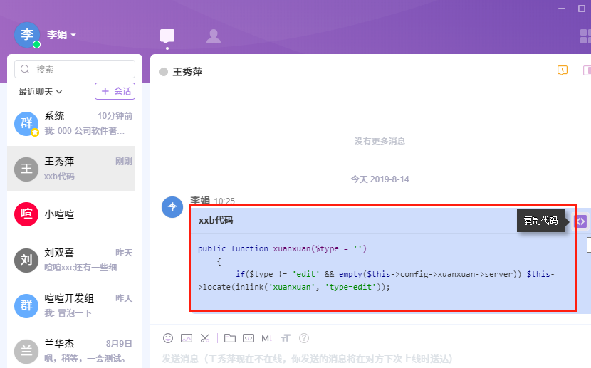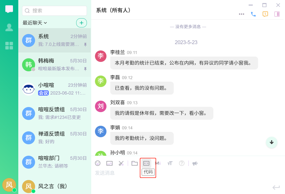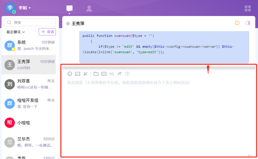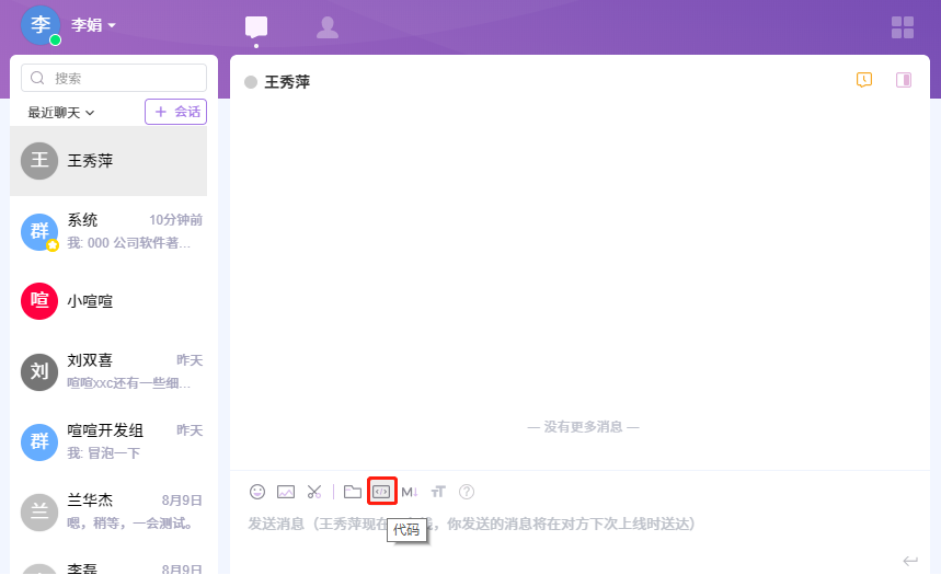 点击喧喧聊天会话消息框上的代码图标,就可以进入代码输入框。