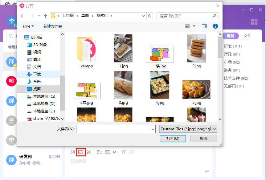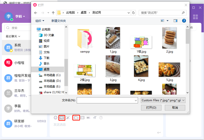 点击图片或者文件按钮,获取图片或文件,选中,点击打开即可。