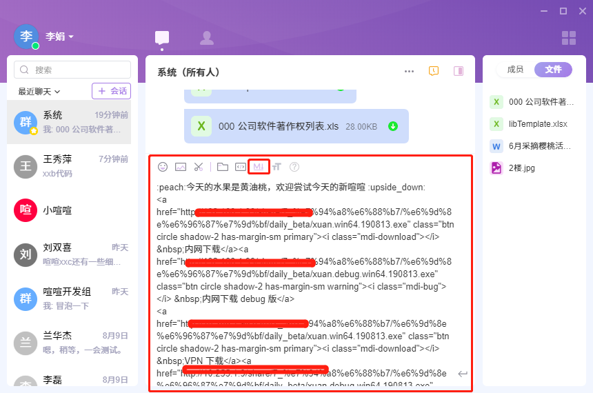 喧喧客户端的 Markdown 默认是禁用的,需要点击一下 Markdown 图标启用才可以使用。