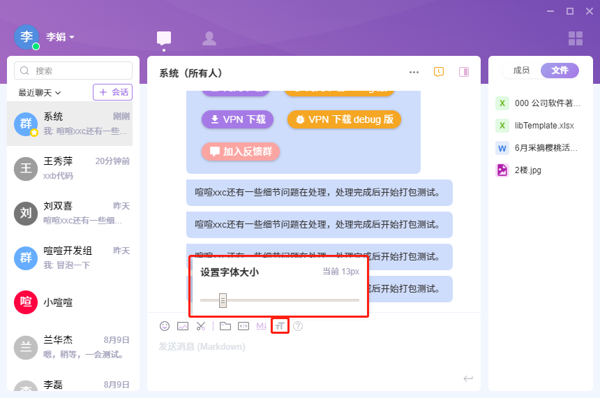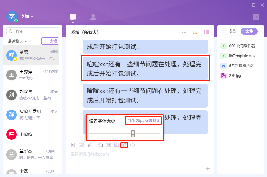 通过点击会话聊天消息框的设置字体大小,打开设置对话框,默认的字体是13px。