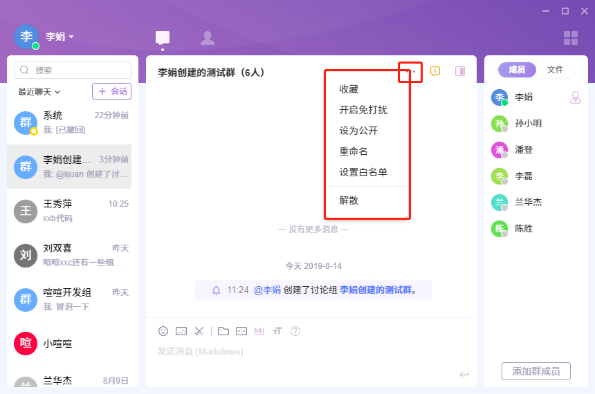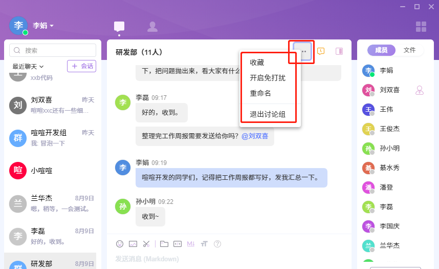 点击群组会话聊天窗口右上角的更多按钮,下拉菜单里就是显示我们能对群组做的一些操作:收藏、开启免打扰、重命名、退出讨论组。