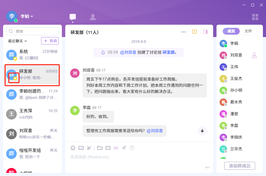 - 转发: 可以把消息转发给别的成员、讨论组。