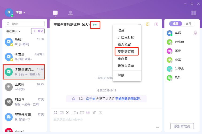 你可以把群链接在Markdown下发送给其他成员,邀请加入该群。