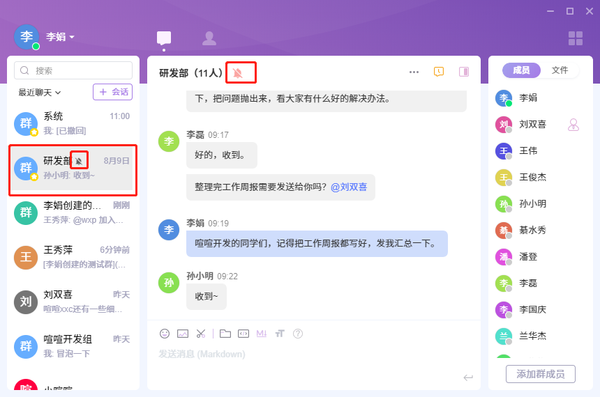 - 开启免打扰: 当会话消息多时,可开启免打扰,免打扰模式会自动关闭消息提醒。