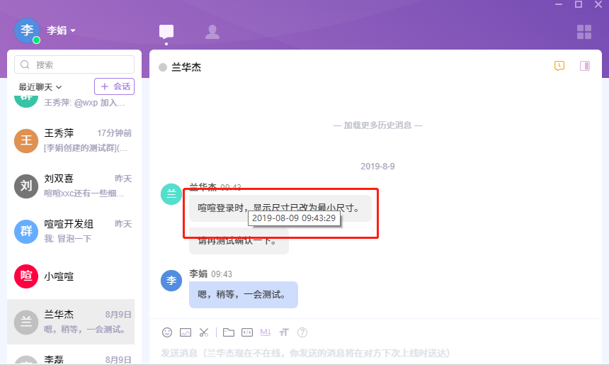 把鼠标放到消息的气泡上,会悬停显示该条消息发送的日期时间。