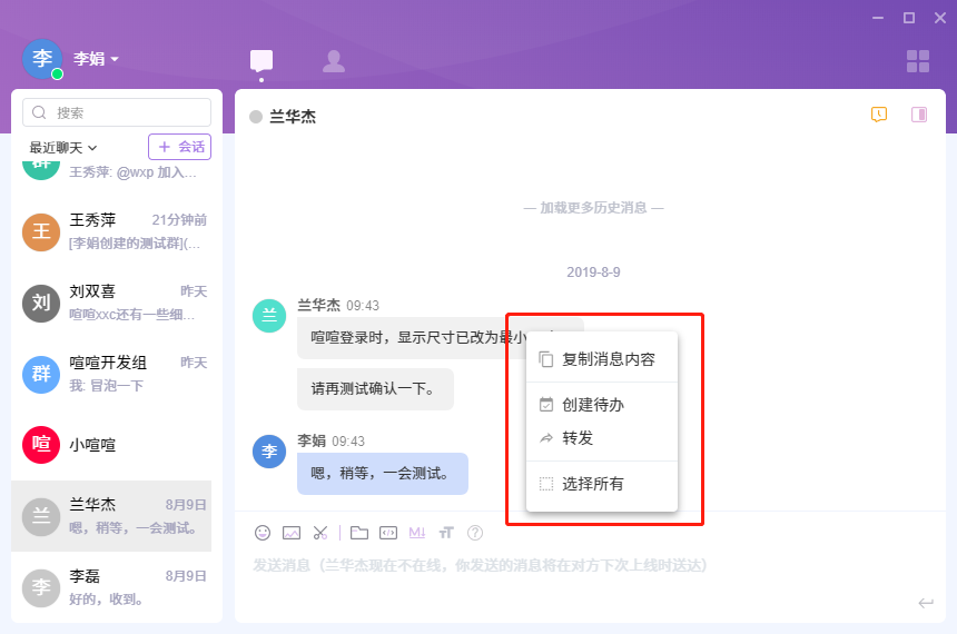 鼠标放在消息气泡上,右键可以显示可以对消息的操作:复制消息内容、创建待办、转发、选择所有。