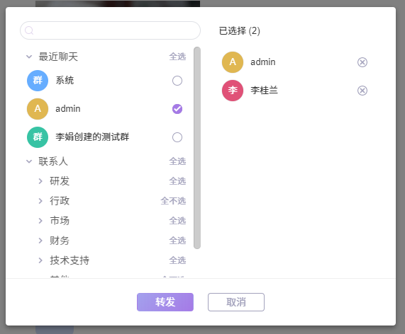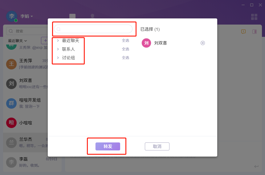 消息右键选择了转发,会跳转到转发弹窗页面,你可以在最近聊天、联系人、讨论组里选择需要转发的成员和讨论组。