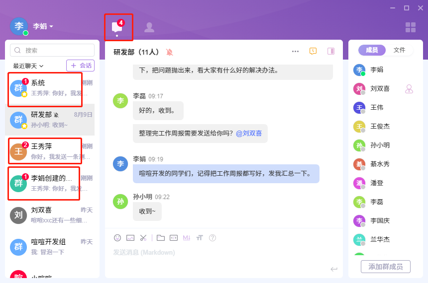 在左侧会话列表,未读消息的条目数分别显示在群组和成员的头像右上角。