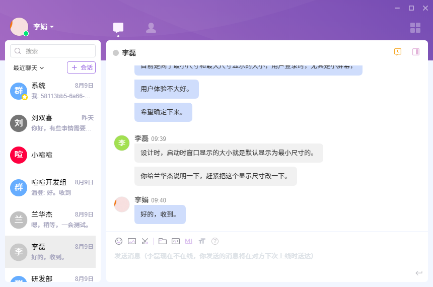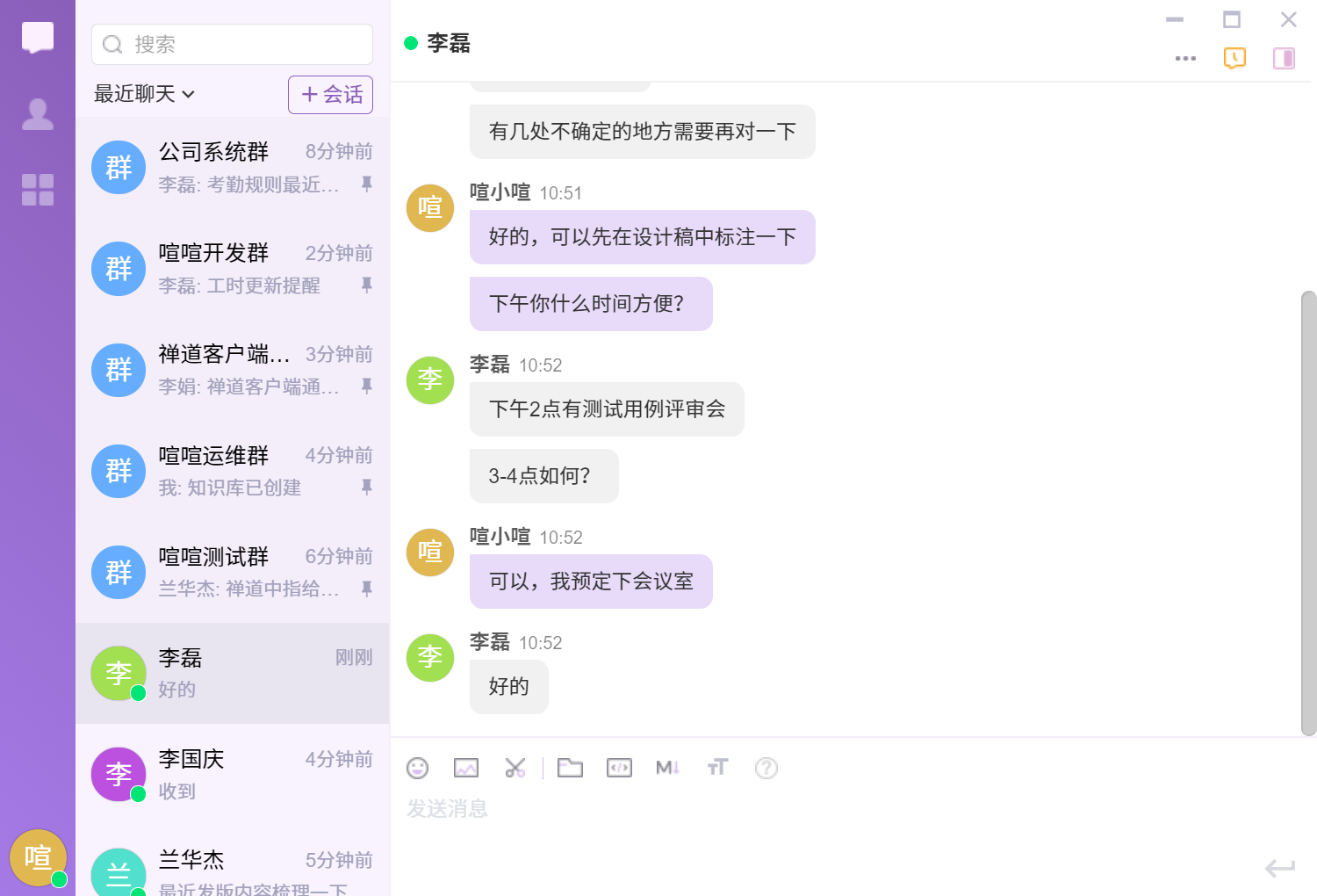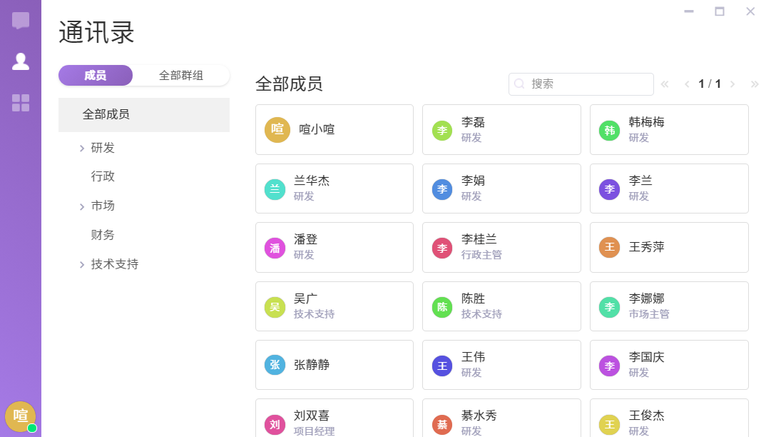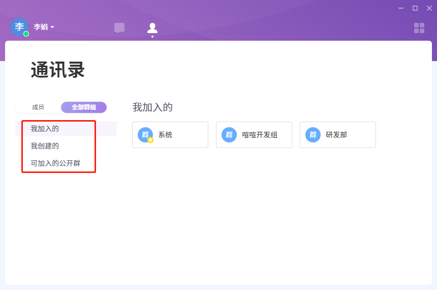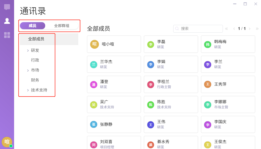 喧喧3.0版本新增了通讯录的功能,通讯录里显示着成员和群组信息。