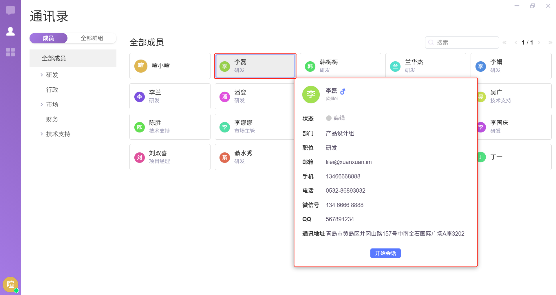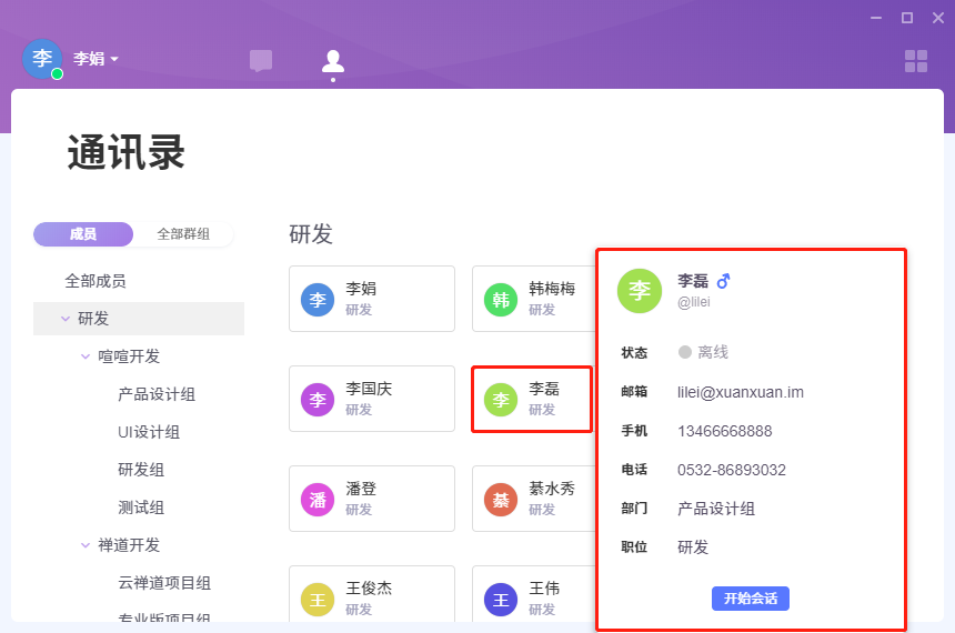 还可以直接点击卡片信息上的“开始会话”,直接跳转到与该成员一对一的聊天会话窗口。