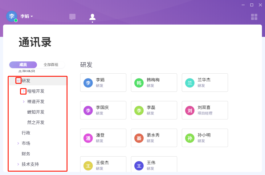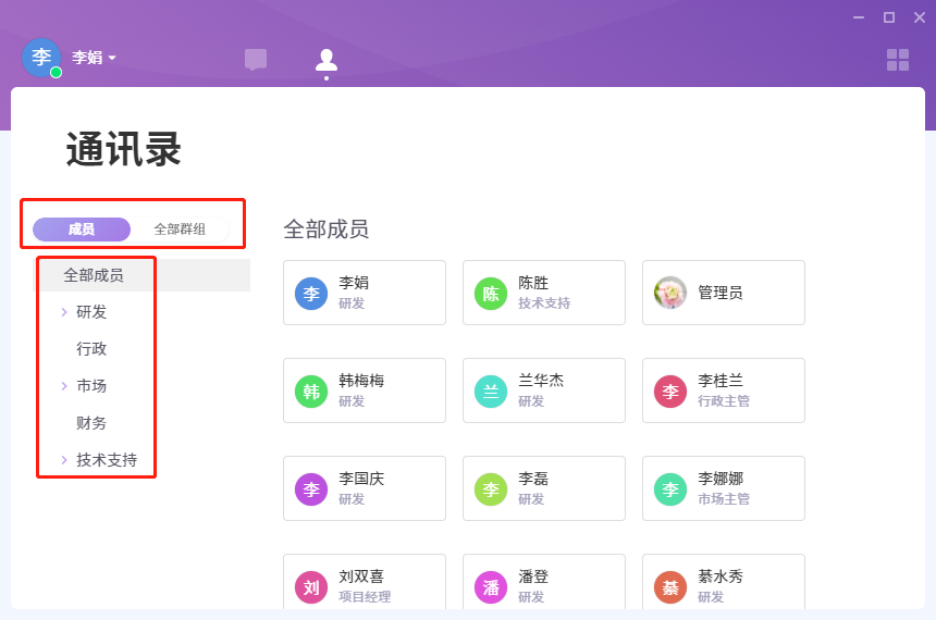 除了直接查看全部成员外,还可以根据部门来查看成员。