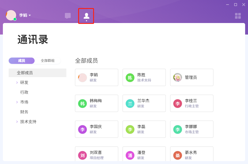 点击通讯录图标,进入通讯录页面,默认显示的是全部成员。