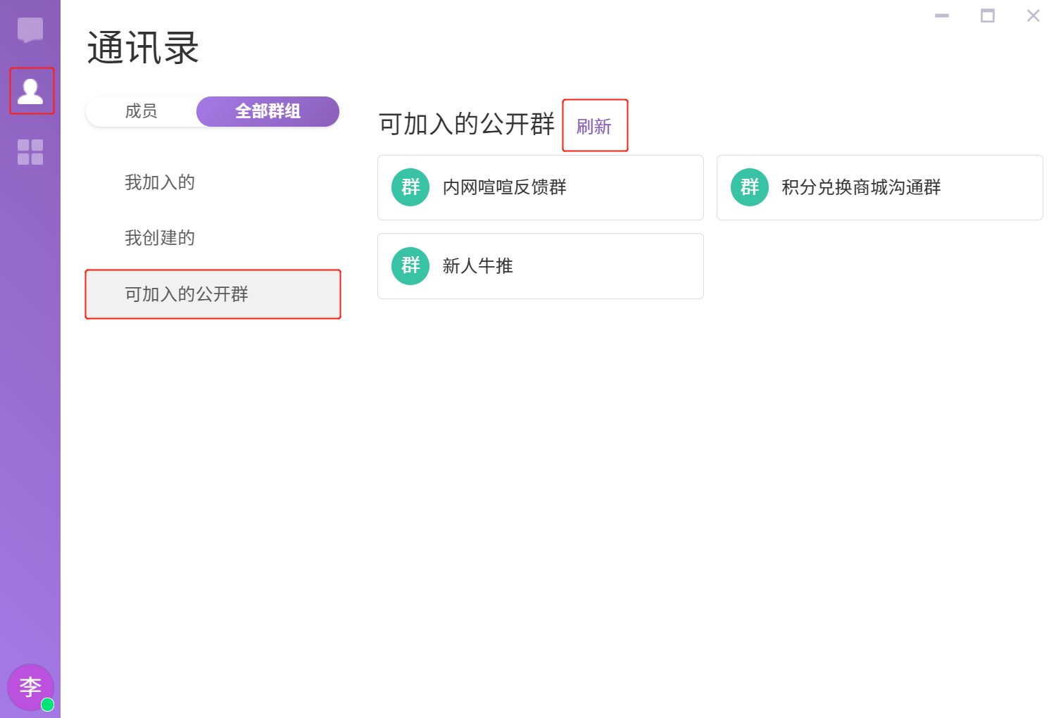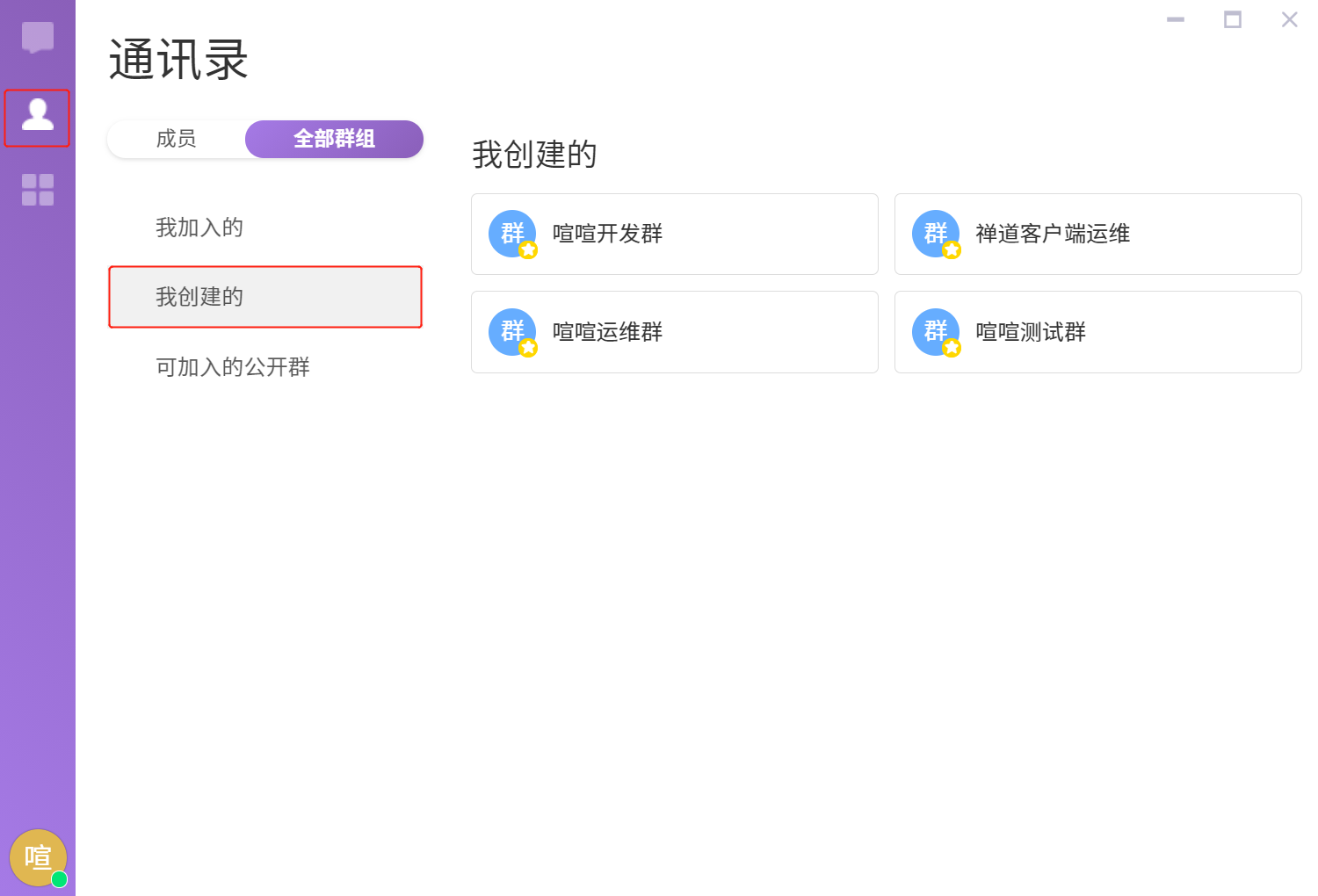 通讯录的群组里显示我加入的、我创建的、可加入的公开群。
