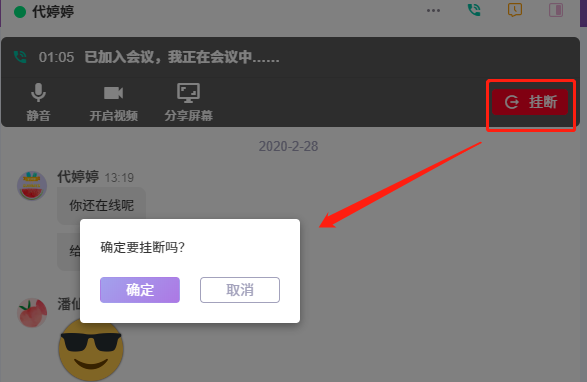 点击右侧的“挂断”按钮,即可结束音视频会议。