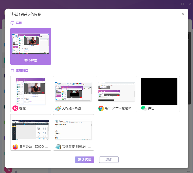 点击“分享屏幕”按钮,即可进入屏幕分享的选择页面。