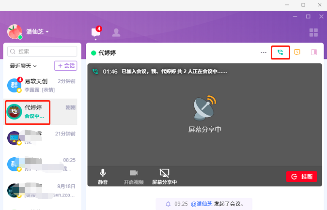 点击会话窗口的右上角中,下图红框内的“发起会议”按钮,即可开启音视频会话。